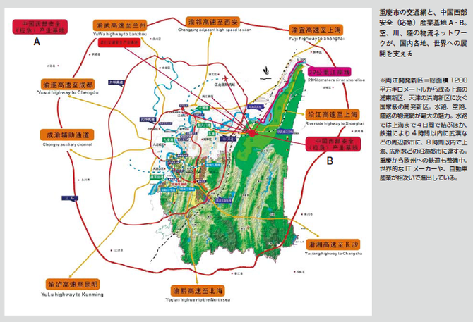 2010年6月には、中国内陸部で唯一の国家級の開発新区となる「両江開発新区」(54ページ図表参照)が、上海の浦東新区、天津の浜海新区に次いで国務院から認可を受けた。両江新区内には日本企業向けの「日本産業団地」の設置も予定されている。