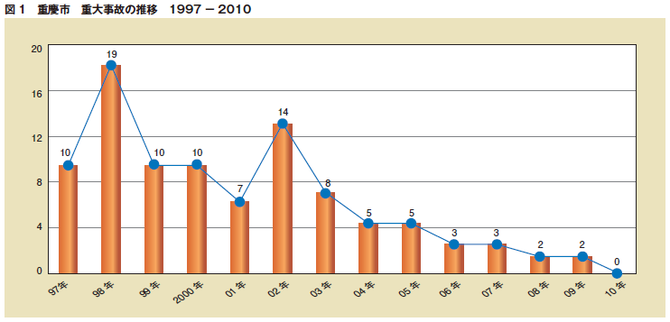 図1は、重慶市における10人以上が命を落とした重大事故の推移を表したものだ。1998年に19件とピークだったものが、2010年にはゼロになっている。 肖局長によれば、安全性が飛躍的に高まった理由は、安全産業都市を目指すという政策理念が市民に広がった成果だとする。
