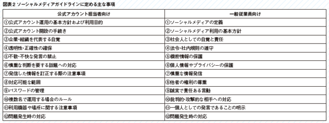 策定の際は、広報部門、営業部門、管理部門などの関係部門間において協議・検討する必要があります。また、ソーシャルメディアガイドラインは、公式アカウント担当者向けと一般従業員向けに分けて策定し、図表2に記載される事項等を定めます。