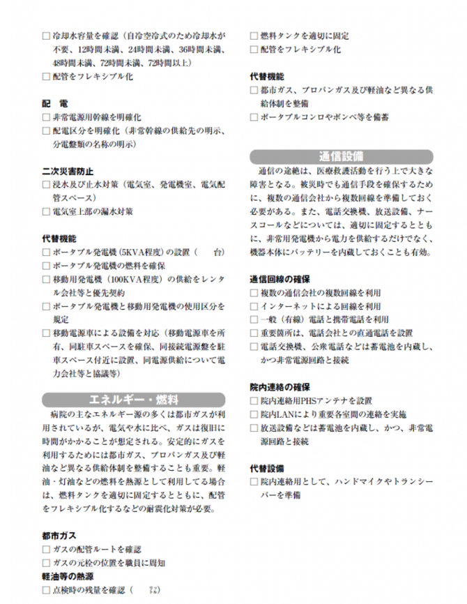 - 病院の施設・設備のチェックポイント「電気、燃料、通信」