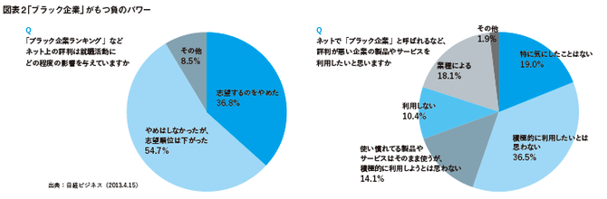 「ブラック企業」は、2ちゃんねる掲示板への書き込みをもとに若者の間で広まった言葉ですが、最近では、新聞、雑誌、テレビなどのマスメディアでも取り上げられることが多くなっています。企業にとって、世間からブラック視されることのリスクは大きく、社会的信用を失ってしまうことにもなりかねません。