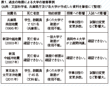 兵庫県南部地震は、兵庫県の都市部を襲った直下型地震であり、主に建物の倒壊、崩壊や地震後の広域火災により多くの人命が失われた。京阪神地域の大学は、多かれ少なかれこの地震による影響を受けているが、中でも兵庫県内では44大学に被害が発生、うち9大学は全壊を含めた大規模被害を受けた。