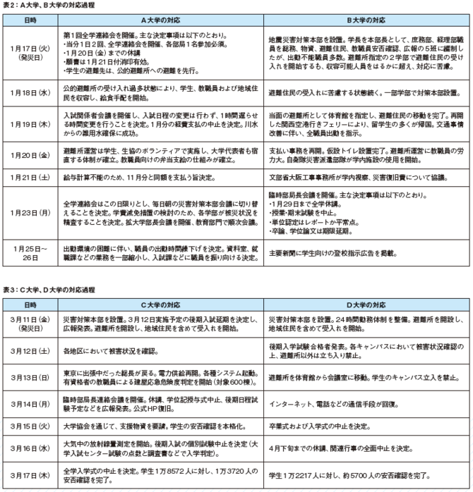 A大学は、兵庫県に本拠地を置き、多数の学部を有する私立大学であるが、この地震により、学生15人、教職員8人が死亡、被害は建物および備品設備類をあわせて3億7000万円に及んだ。また、やはり多数の学部を擁する国公立のB大学は、学生39人、教職員2人が死亡、備品設備類の被害だけでも26億4000万円に及んだ。A大学およびB大A学の公式記録をもとに、発災後10日間の対応過程を明らかにしたのが表2である。