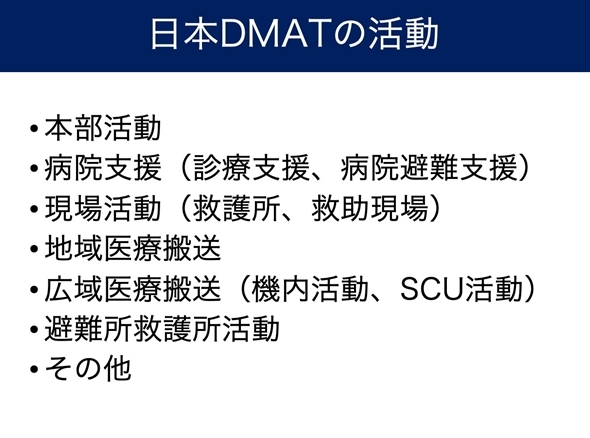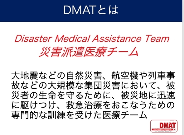 DMAT、災害派遣医療チームとか聞くと、被災現場にガンガン入っていって、がれきの中から人を救い、その場で聴診器をあてたりして、人命救助するようなドラマのシーンを想像する方も多いのですが、重視されているのは、情報収集体制と搬送体制です。