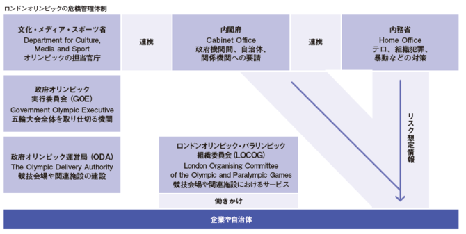 大会の3年前から、内閣府や内務省などでは、オリンピック開催期間のリスク分析を行いました。テロ、暴動、集団犯罪などの危機ごとに詳細な被害の想定をし、それぞれの対策にどのようなリソースをどの程度割り当てるかなどの計画を策定し、関連する機関に対して必要な対策を要請しています。
