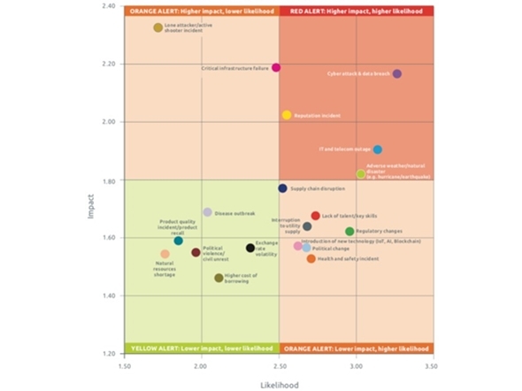調査結果のうち、まず過去12カ月間に経験した最も重大な脅威は「IT・通信の途絶」(IT and telecom outage)、また今後12カ月間に最も懸念される脅威は「サイバー攻撃とデータ漏えい」(Cyber attack & data breach)であり、これらは過去4回にわたって不変である。しかしながら今回の報告書では分析のしかたが大きく変わり、様々な脅威が発生する可能性(もしくは頻度)と影響の大きさとの2軸によるマトリクスにまとめられている。