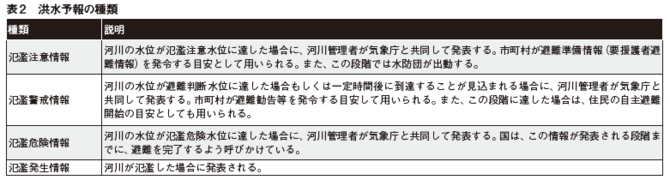一方、洪水予報は、河川管理者と気象庁が共同で発表するものであり、いくつかの種類がある(表2)。