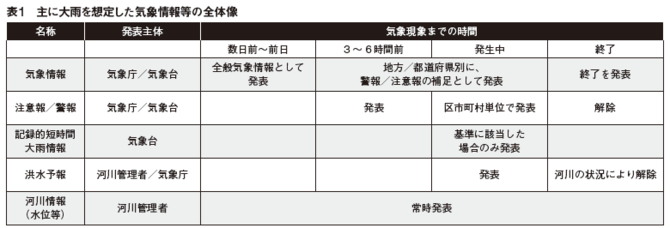 印刷業は、紙を大量に使用する事業の性質上、洪水などの水害には特に弱い。ただ、水害は、発災の前から発表されるさまざまな気象情報等に基づき、発災直前まで被害を軽減するための対応をとることができる。この点、現在の最先端の技術を用いても、発災数十秒前に検知することができるにとどまる地震災害とは異なる。気象情報等の発表主体や発表タイミングを表1として取りまとめた。