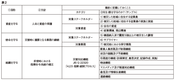 表2をご覧いただきたい。①目的、②方針に続いて③何を・誰を守るのか?(サンプル)を定義してみた。この内容によって情報処理活動の細部が変わってくる。