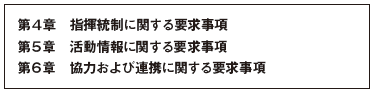 簡単に要約すると、第4章で「災害対策本部はどのように活動するか」という手順についての仕様が書かれ、第5章では「その活動を支えるための情報をどのようなプロセスで提供するか」について書かれている。本稿では第4章で災害対策本部の活動プロセス概要を確認し、第5章の情報提供プロセスの一部を扱って「標準化」について述べることとする。第6章については割愛する。