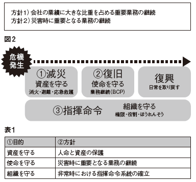 そもそも会社などの組織は、その存続を脅かす危機に対して図2に示す3つの対応を必要とする。この内容を目的と目標として表1に要約した。なお、この目的・目標の設定の仕方は筆者独自の考え方に基いており、違う方法もあろうかと思う。読者の属されるそれぞれの組織で実装される場合は、組織の災害対応方針を適用されたい。