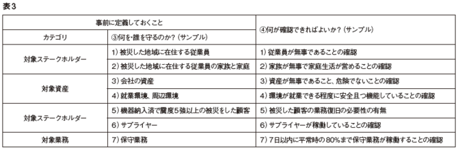 方針1)は理解しやすいと思うので、方針2)について解説をする。「災害時に重要となる業務」とは、たとえば、エレベーターやIT 機器など、顧客先に設置されて日々稼働しているハードウェア・ソフトウェアなどの継続的な使用を保証するメンテナンス業務が挙げられる。筆者の多くの顧客では、このような顧客資産を持つ場合、その対応を災害対応の優先順位において最上位に掲げることが多い。