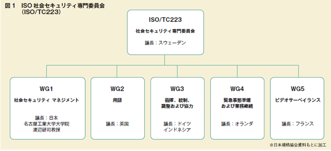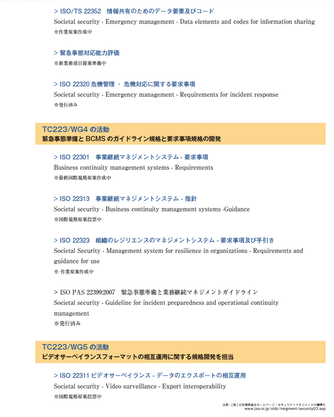 現在、TC223 には、WG 1から WG 5まで5つ のワーキンググループがあり(図1) 、民間企業の事 業継続力だけでなく、公的機関も対象にした規格ま で幅広く検討・開発が行われており、社会全体のセ キュリティ向上を大きなミッションに掲げている。 WG1 ∼ WG 5までの活動内容と、それぞれが開 発している規格は次の通りだ。