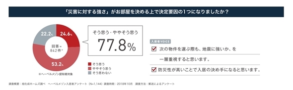また、災害に対する強さがお部屋選びの決定要因の一つになったかという質問に対し、そう思う、ややそう思う合わせて77.8%ありました。「防災性が高いことで入居の決め手になると思います」という実際に入居された方の声は切実です。