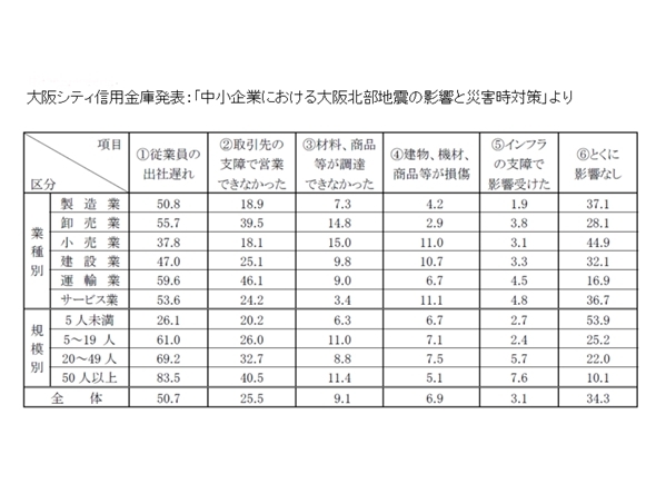 大阪シティ信用金庫が2018年7月24日に発表した「中小企業における大阪北部地震の影響と災害時対策」によると、地震で「操業に支障が生じた」企業は26.3%と4分の1以上の企業が何らかの支障があったと答えている。具体的な影響では「従業員の出社遅れ」(50.7%)、「取引先の支障で営業できなかった」(25.5%)が目立った。交通網の寸断や取引先の受入れ停止などが影響している。
