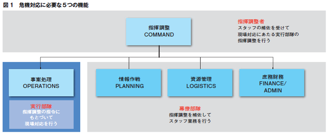 火災に例えると、指揮調整者は「火を消せ」と命 令をする人。情報作戦部門は、火がどこまで広がっ ているか状況を把握し、技術的にどうやって消すか 作戦を練り、どこまで消したか、いかに消したかを 情報収集し記録する。資源管理部門は火を消すため の消火器やホース車両などを用意する。庶務財務部 門は、火を消すためにかかる費用を積算したり、火 を消す人の安全を考えたり、 火災後の保険をはじく。 そして事案処理部門が実際の消火活動にあたること になる。もちろん組織の規模に応じて 100 人で災害 対応にあたるところもあれば、1人ですべてこなさ なくてはいけないところもあるだろうが、機能としては、これら5つに集約されるとする。