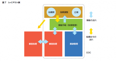 例えば指揮調整は、定期的に組織トップや幹部が話し合えるよう大きめの調整会議テーブルを用意し ておく。②情報作戦、③資源管理、④庶務財務は、 指揮調整者を支援する幕僚的な機能を担うため、指 揮調整の近くに配置する(図7) 。