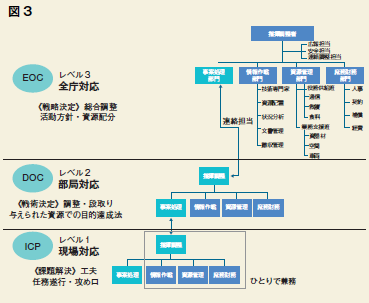 この仕組みさえ統一しておけば、広域災害におい て、本社と部局レベル、現場レベルで連携がとりやすくなる(図3) 。