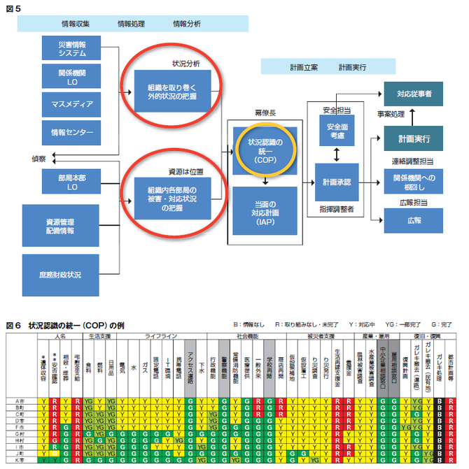 図6は、東日本大震災において、牧教授が岩手県 に提案した COP だ。どのような被害に対して、ど こまで対応をしたかが、1枚の紙ですべて説明できるようになっている。