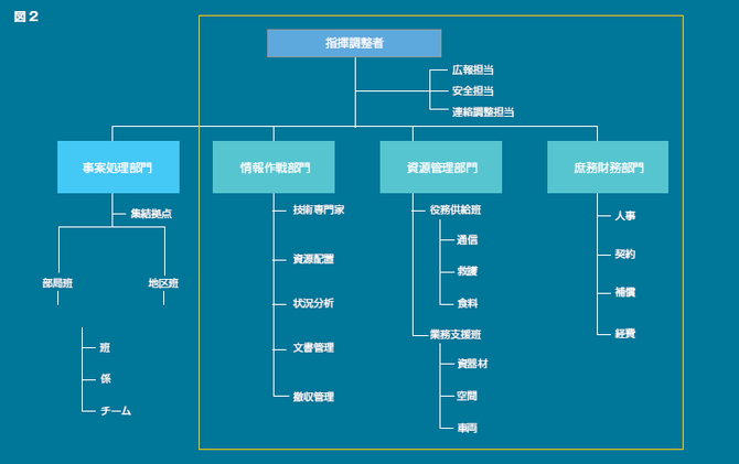 ICS の機能を、簡単な組織図として表したのが図2。自治体なら指揮調整者は首長。情報作戦、資源管理、庶務財務は、総務部や危機管理部 門が担当する。事案処理は土木、建築、環境、市民 生活、商工部などの各部、あるいは現地の出先機関 がこれに該当する。