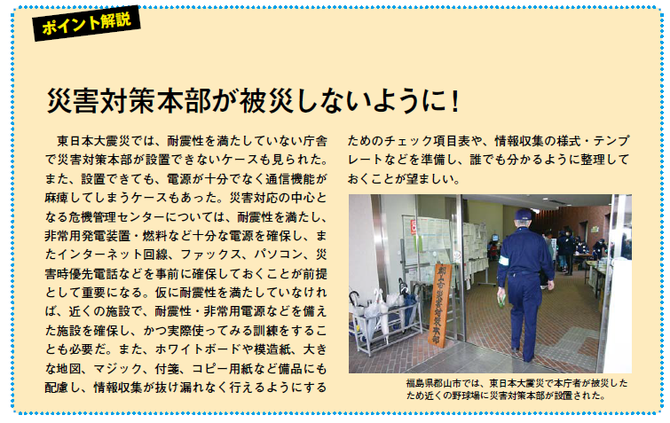 また、規模の大きな組織の場合、危機対応にかか わる全ての職員が同じ部屋に集まって対応するとい うのは現実的ではなく、各部局ごと、あるいは支局 ごと災害対策本部支援室を設置し、そこから情報連 絡員(リエゾン)を本部の危機対応センターに派遣 するという方法も取れる。ただし、この際、情報連 絡員は各部局のトップ、もしくはナンバー 2 である 必要があるとする。