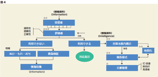 こうした組織内、組織外の情報に基づき、情報作 戦部門は「当面の活動計画」を作成し、指揮調整者 の承認を得て、実際の対応にあたることになる(図 5) 。これをスムーズに行うためには指揮調整者は じめ組織全体が、一元的に情報を共有できる「状況 認識の統一」 (Common Operational Picture: COP)が重要になると牧教授は語る。