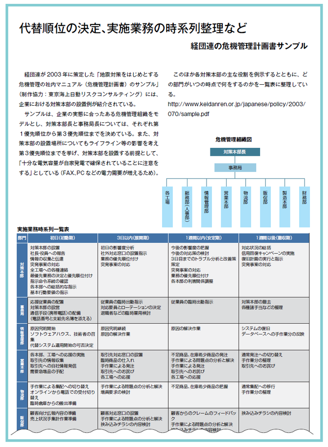 一般企業なら指揮調整者は社長か、あらかじめ決 められた災害対応のトップが就く。その他の機能は 危機対応における各部門の業務をあてはめて考えれ ばいい。例えば、人事部門が社員の安否を把握するのであれば資源管理に、生産部門が自社施設の生産 状況を把握するのであれば庶務財務に、施設部門が 工場が被害を受けた施設の復旧を行うのであれば事 案処理に̶̶といった具合だ。営業や製品開発、顧 客対応などの事業部、もしくは各支店、営業所は事 案処理に当てはめられる。