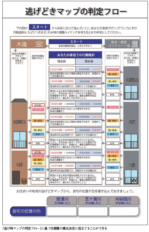 最大の特長は、それぞれのマップで自分の住んでいる地区の特性が確認でき、避難するか自宅に留まるべきか、どのようなタイミングで避難すべきかなど、住民が自ら考え、意思決定できるように「逃げどきの判定フロー」がついていること。