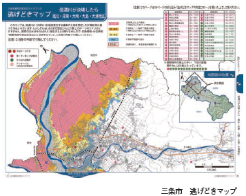全戸に配られる「三条市豪雨災害対応ガイドブック」は、A4版46ページの小冊子で、「気づきマップ」「逃げどきマップ」「浸水想定区域」「土砂災害危険箇所図」の4種類の「行動指南型のハザードマップ」になっている。