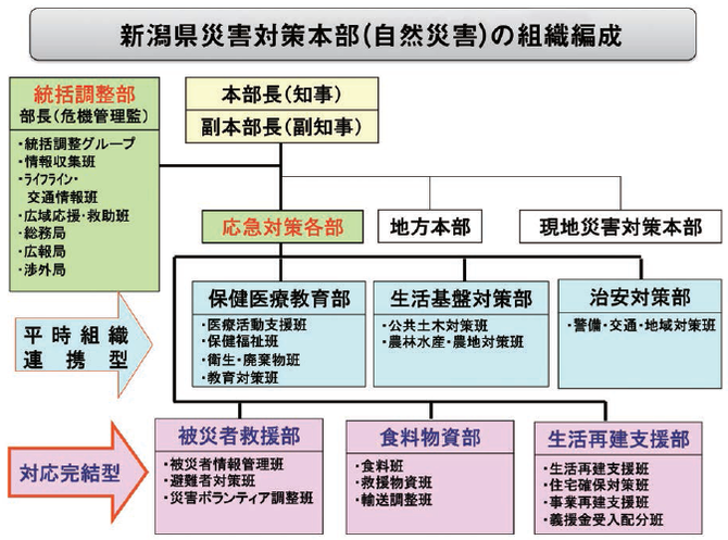 第一歩として、県として市町村を早期に支援できるよう、24時間の災害警戒体制と即時登庁体制を整え、指定登庁職員はメール配信で召集できるようにした。緊急事態には、地域機関から市町村へ応援職員を派遣できるよう、各地域機関には情報収集・連絡用の衛星携帯電話も配備した。2009年には、危機管理センターが完成。対策本部要員は事前に指定し、スタッフは50人から118人に増やした。幕僚機能を強化した全庁体制 一方、中越地震の対応では、対策本部の下に各部署が一直線にぶら下がる構造だったため、「被災者支援」「食料提供」「住居の再建」といった災害時特有の業務をどの部署が担当するか不明確になり、対応が遅れがちになる課題が顕在化した。そのため、災害対策本部の幕僚機能を強化するとともに、災害対応業務に即した組織編制に切り換えた。