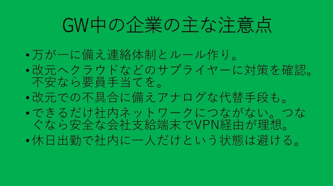 それでもつなぎたい場合は、「会社が支給した安全な端末で、VPN(バーチャル・プライベート・ネットワーク)経由でつなぐこと。私用の端末や安全でない回線でつながないというのは基本中の基本だが、連休こそ基本をきっちりしてほしい」と徳丸氏は語る。
