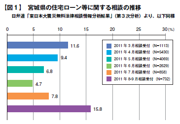 相談割合の推移をみると、災害直後から相当のニーズが存在したが、数カ月でいったん減少している。これは、①弁護士が法律相談活動の最重要課題として、金融機関が講じた支払い猶予措置と個別連絡先窓口の周知徹底に努めたこと、②これにより、支払い猶予措置が浸透し当面の支払や督促に被災者が悩む必要がなくなったこと、③抜本的解決のための新制度構築が未定であり弁護士も明確な指針を示せなかったこと、が影響している。決して、問題が解決してニーズが減少したわけではないことに注意が必要である。その証拠に、「個人債務者の私的整理に関するガイドライン」が2011年7月に策定され、破産等の法的手続きによらない債務減免が可能になる場合があると周知されるや、全体に占める「住宅ローン等」の相談割合は再び急増している。