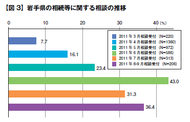 図3は、被災当時の住所が岩手県の場合における「遺言・相続」の相談割合の月次推移を示したものである。相続人の確定、行方不明者がいる場合の問題、借金がある場合の相続放棄の問題など、相談内容は複雑である。
