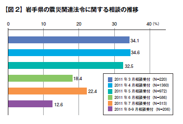 図2は、被災当時の住所が岩手県の場合における「震災関連法令」の相談割合の月次推移を示したものである。
