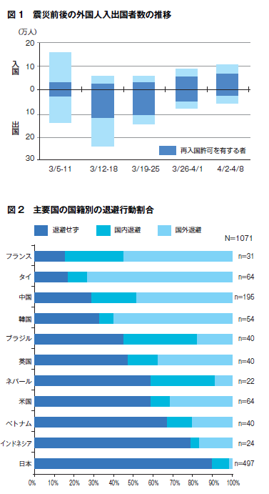 全国の登録者数の約半数を占める。 震災前後の外国人の入出国者数の推移については、2011年の通商白書に紹介されているが、震災直後の3月12−18日には、入国者数が急激に減り、それに伴い出国者数が急増した(図1)。特に、再入国許可を有する者(主に留学生やワーキングビザ所有している長期滞在者とその家族)の海外退避の傾向が著しく増加した。その傾向は3月末まで続き、4月上旬にようやく回復をしている。