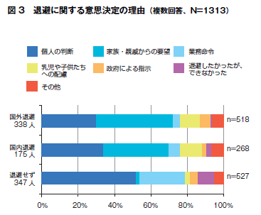 退避に関する意思決定の理由としては、国外退避者・国内退避者ともに家族・親族からの要望、乳児や子供たちへの配慮が多く、逆に退避しなかった人の理由は個人の判断、会社の業務命令との理由が高かった(図3)。