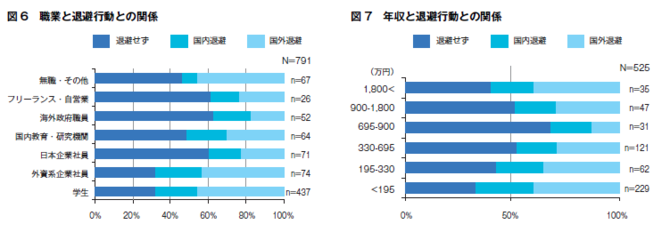 職業と退避行動についての問いでは、国外退避・国内退避ともに割合が高かったのは学生と、外資系企業の社員であることが分かった(図6)。逆に、日本企業の社員や海外政府職員、フリーランス、自営業者は退避しない割合が高い。 また年収と退避行動との関係については、国外退避の割合が高いのは1800万円以上の高額所得者と、330万円以下の低額所得者で、職業と退避行動における結果を裏付けた(図7)。