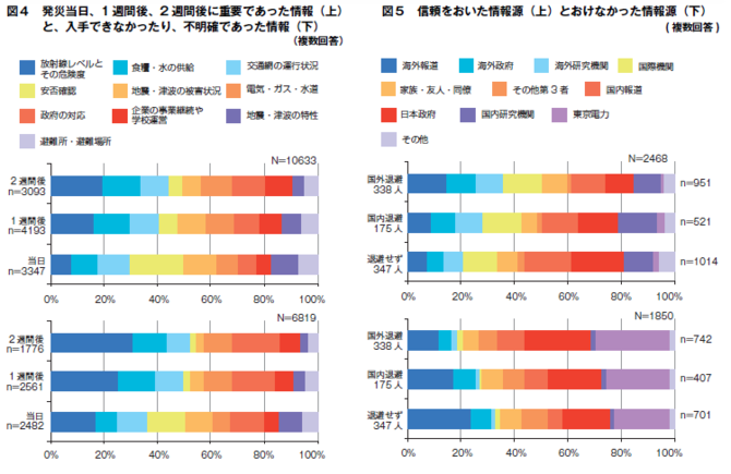 調査ではまた、「信頼をおいた情報源」と「信頼をおけなかった情報源」について聞いており、この結果、国外退避者は海外報道や海外政府、海外研究機関など、主に海外の情報を信頼していたのに対し、退避しなかった人は、国内の情報を主に信用していたなど対応の差が明らかになった(図5)。