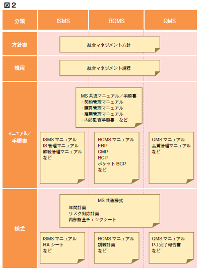 各マネジメントシステムの文書も共通化した。具体的には①方針書、②規程、③マニュアル・手順書、④様式の4種類に分類し、統合リスクマネジメント方針を最上位文書とし、統合リスクマネジメント規程を策定し、共通ルールを定めた(図2)。
