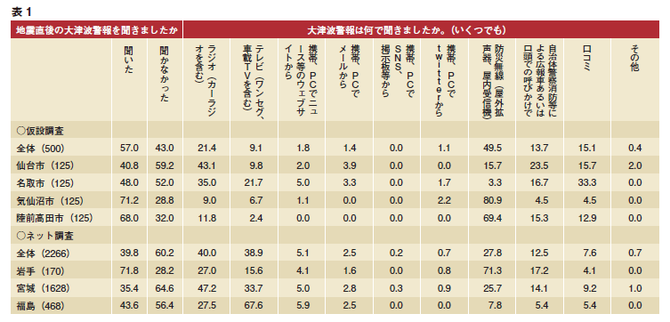 大津波警報の認知率を地域別にみると、仮設調査では陸前高田市と気仙沼市が約7割に上ったのに対し、名取市は約5割、仙台市は約4割にとどまった。ネット調査でも岩手県が7割を超えたのに対し、宮城、福島両県は4割前後と地域によって違いが大きかった。仮設調査では、陸前高田、気仙沼両市では「防災無線」で聞いた人が7割から8割に上ったが、仙台市では約15%、名取市では約3%と極端に少なく、ネット調査でも岩手県は「防災無線」で聞いた人が7割を超えたが、宮城県は約25%、福島県は約8%にとどまった。(表1)