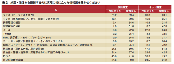地震・津波から避難するのに実際に役立ったメディア・情報源は、仮設調査では「口コミ」が43.6%で最も多く、以下「ラジオ」29.2%、「自分の経験と知恵」24.8%、「防災無線」21.6%、「自治体、警察、消防等」21.4%など。ネット調査では、「ラジオ」が69.3%とトップで、「口コミ」53.3%、「テレビ」46.9%、「自分の経験と知恵」24.5%、「自治体、警察、消防等」23.6%、「メール」22.3%などの順だった。(表2)