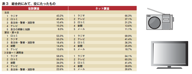 安否情報では、仮説調査は全期間で「口コミ」が1位で、「ラジオ」が2位。ネット調査では全期間で「ラジオ」がトップ。2位と3位には「メール」と「テレビ」ないし「携帯」が入った。
