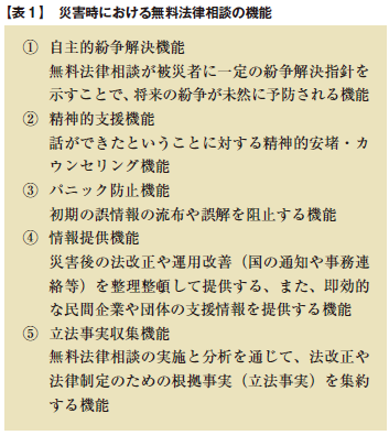 巨大災害の発生時には、被災者(企業)に爆発的ともいうべきリーガル(法的)ニーズが発生する。私人間の契約や紛争、家族の問題、生活再建、事業再生、公的支援等、無制限と言ってよい。そのような中で、弁護士による法律相談が果たす機能は【表1】のように整理できる(※1)。