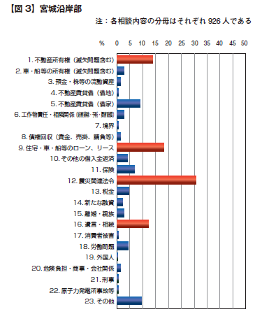 【図3】は、平成23年4月29日から同年5月1日の3日間、宮城県下の95カ所の避難所を延べ300名の弁護士が合計約1000件実施した無料法律相談の結果である。相談者は津波被害のため避難所に避難している被災者がほとんどである。相談の上位は、①「震災関連法令」30.5%、②「住宅・車・船等のローン、リース」18.0%、③「不動産所有権(滅失問題含む)」14.1%(浸水地域の権利関係、建築制限問題、権利証や登記簿謄本紛失等、高台移転と買取りの問題等)④「遺言・相続」12.5%、である。岩手県の相談傾向に類似しており、津波被害の深刻さを物語っている。