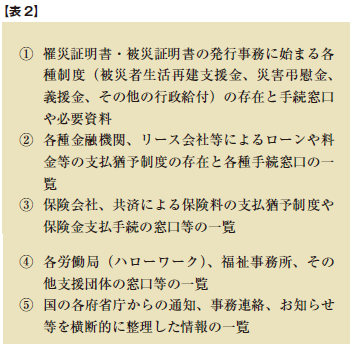 このうち多くは、本来ならば地方公共団体が窓口で実施すべき情報提供業務のはずである。裏を返せば、災害時の地方公共団体は、情報提供機能を、平時にも増して維持し続けなければならないことが証明されたと言える。東日本大震災では、ほとんどの地方公共団体において、かつて実施したことのない制度を適用し、膨大な事務作業が発生した。住民に制度の存在を周知する作業も初めてのことであった。これらを助け、周知・説明機能を代替したのが、まさに弁護士による大量かつ迅速な無料法律相談であった。