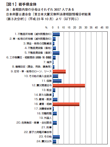 【図1】は、被災当時の住所が岩手県の被災者の相談実績とその分布である。相談の上位は、①「震災関連法令」29.1%(被災者生活再建支援法の解説等、災害弔慰金の支給に関する法律の解説等、生活保護、各種行政支援・通知・事務連絡等の解釈、罹災証明・被災証明の発行等)、②「遺言・相続」24.3%(相続放棄の問題、負債・財産調査、行方不明者の問題、死亡届・認定の問題、遺産分割協議の問題等)、③「住宅・車・船等のローン、リース」11.5%(担保滅失による借入金の帰趨の問題、いわゆる「二重ローン」の問題、金融機関やリース会社との協議の問題、窓口情報提供、私的整理ガイドライン、債権買取りの提言等)である。 岩手県は、沿岸部が津波により壊滅的な被害を受けた一方で、都市部である盛岡市などは震度5強の地震ではあったものの、大規模な倒壊被害や建物の滅失被害は免れている。都市部との対比において、沿岸部の深刻な被害状況が反映されたものと評価できる。