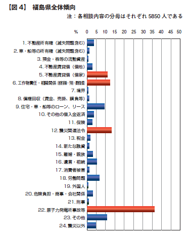 【図4】は、被災当時の住所が福島県の被災者の相談実績とその分布である。相談の上位は、①「原子力発電所事故等」36.2%(損害賠償・仮払金問題、避難生活、契約関係、原発事故と賃貸借に関する問題、風評被害、放射能汚染、警戒区域等の立入、行政による支援策等)②、「震災関連法令」12.8%、「工③作物責任・相隣関係」12.1%、④「不動産賃貸借(借家)」10.9%、⑤「住宅・車・船等のローン、リース」9.4%、である。