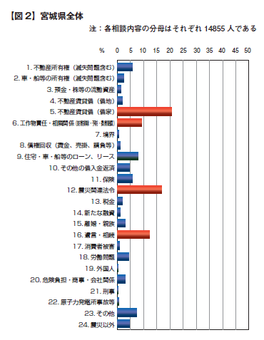 て壊滅的な津波の被害を受けている一方で、仙台市が震度6強の激震に襲われている。そのため、「不動産賃貸借(借家)」や「工作物責任・相隣関係」(自宅は損壊したものの、被災当時の自宅に居住可能なケースがほとんどである)の問題がリーガル・ニーズの上位になったと評価できる。