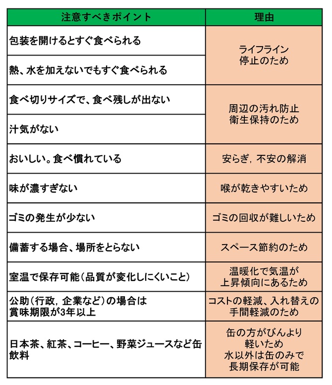 表:帰宅困難者のための備蓄に適した食べ物、飲み物の要件