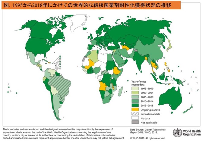 開発途上国を中心に結核が大発生しており、各国はその対策に追われています。 現在の治療は、短期化学療法が本流ですが、抗結核薬の服用を中断する事例があまりに多く壁に直面しています。薬剤の服用中断は、結核が完治しないどころか薬剤耐性菌を生み出す原因となり、治療に大きな障害を引き起こしています。薬剤耐性菌は世界中に分布しており、結核患者数が減少しない最も大きな要因となっています(図)。